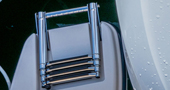 A boarding ladder on a recreational boat providing easy access to and from the water. It is designed to allow individuals to safely enter and exit the boat when swimming, snorkeling, or engaging in water activities. Boarding ladders come in various types, with some being detachable and foldable for convenient storage when not in use, while others are fixed to the boat's transom. The ladder is typically made of durable materials like stainless steel or aluminum to withstand exposure to water and provide a sturdy platform for boarding.
