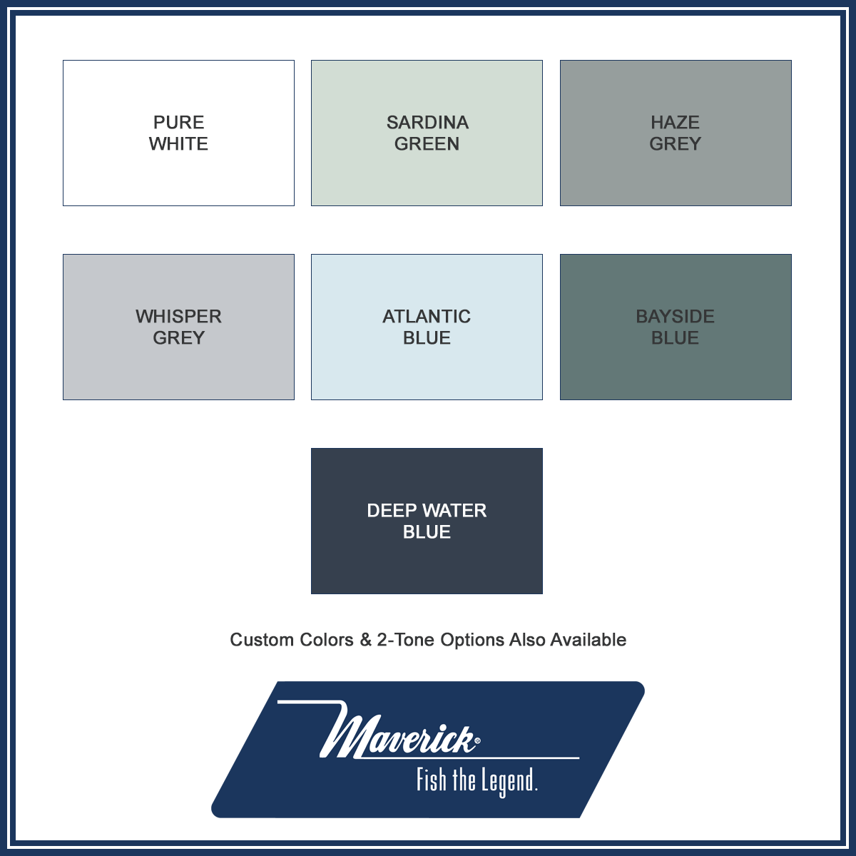 The Maverick 17 HPX-V offers a diverse palette of color options that allow owners to personalize their skiff to match their style and preferences. Whether you prefer the crisp, classic look of Pure White or the serene vibes of Sardina Green, there's a color to suit every taste. Haze Grey provides a modern, understated elegance, while Whisper Grey offers a subtle, sophisticated charm. For those drawn to the allure of the sea, Atlantic Blue and Bayside Blue bring a vibrant splash of ocean-inspired hues. Each color option is thoughtfully selected by Maverick Boat Group to not only enhance the boat's aesthetic appeal but also ensure durability and resistance to harsh marine conditions.