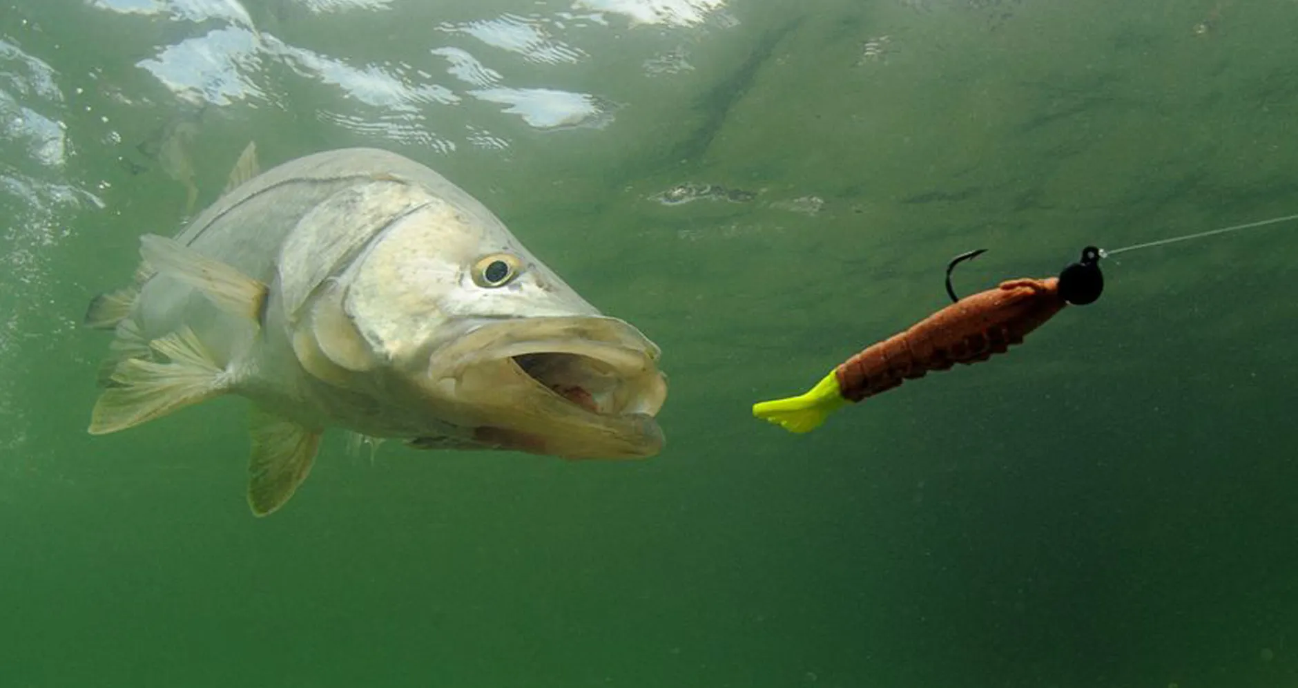 Artificial lures are a safe go-to when Snook fishing; live bait is not necessary. When fishing in shallow depths such as 2-5ft, try using jigs, crankbaits, and swim baits. When near shore or in less than 2 ft of water, try using suspending twitch baits, soft jerk baits or topwater plugs. If fishing in waters deeper than 5 ft, try using swim baits, large crankbaits and heavy bucktails & jigs.