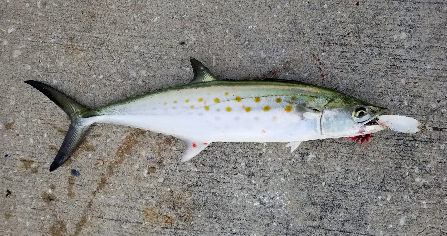 The coloring of this species begins with a bluish-green back that fades into silver down its sides and onto its belly, with irregularly shaped golden-yellow or olive-green spots all over. This is different from the cero mackerel, which has golden-yellow steaks along its midline. It’s size and lateral line also set it apart from the king mackerel; the Spanish mackerel is much smaller and its lateral line slopes gently to the tail from behind the gill cover, rather than abruptly dropping below the second dorsal. The bay mackerel is covered in tiny scales and can reach up to 36 inches in length.