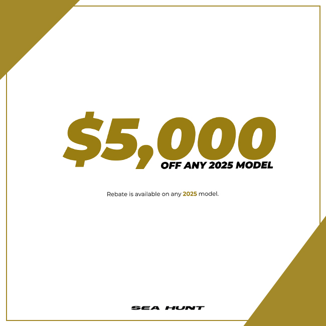 From now through November 30th, 2024 purchase a 2025 Sea Hunt from Ingman Marine and get $5,000 off your boat.
